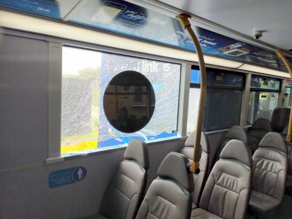 … the lane narrowed and a second double-decker approached us from the opposite direction. With cars backing up, we had nowhere to go except forwards. Our driver attempted inching past the other bus. And it almost worked. But, with a loud metallic bang, bus scraped bus and the window next to us shattered, spraying us with shards of safety glass. We leapt from our seats. The game was up. We were on the road to nowhere.